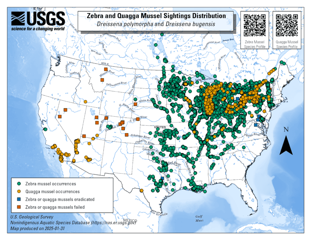 Two specific invasive mussel species—zebra mussels and quagga mussels—have become widely distributed in the Great Lakes and other critical waterways across North America. Once the mussels have infested an area, eradication is virtually impossible.