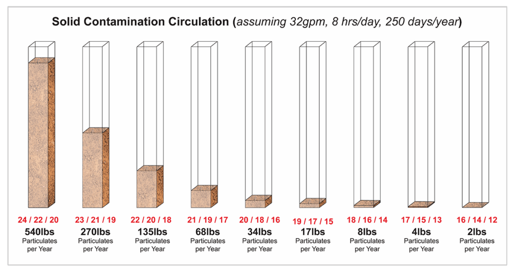 This means that what may seem like a small change in your ISO Code can have huge impacts. Just a few rungs up or down the ISO Class ladder can mean the difference between tens or even hundreds of pounds of solid contamination circulating in your system every year!